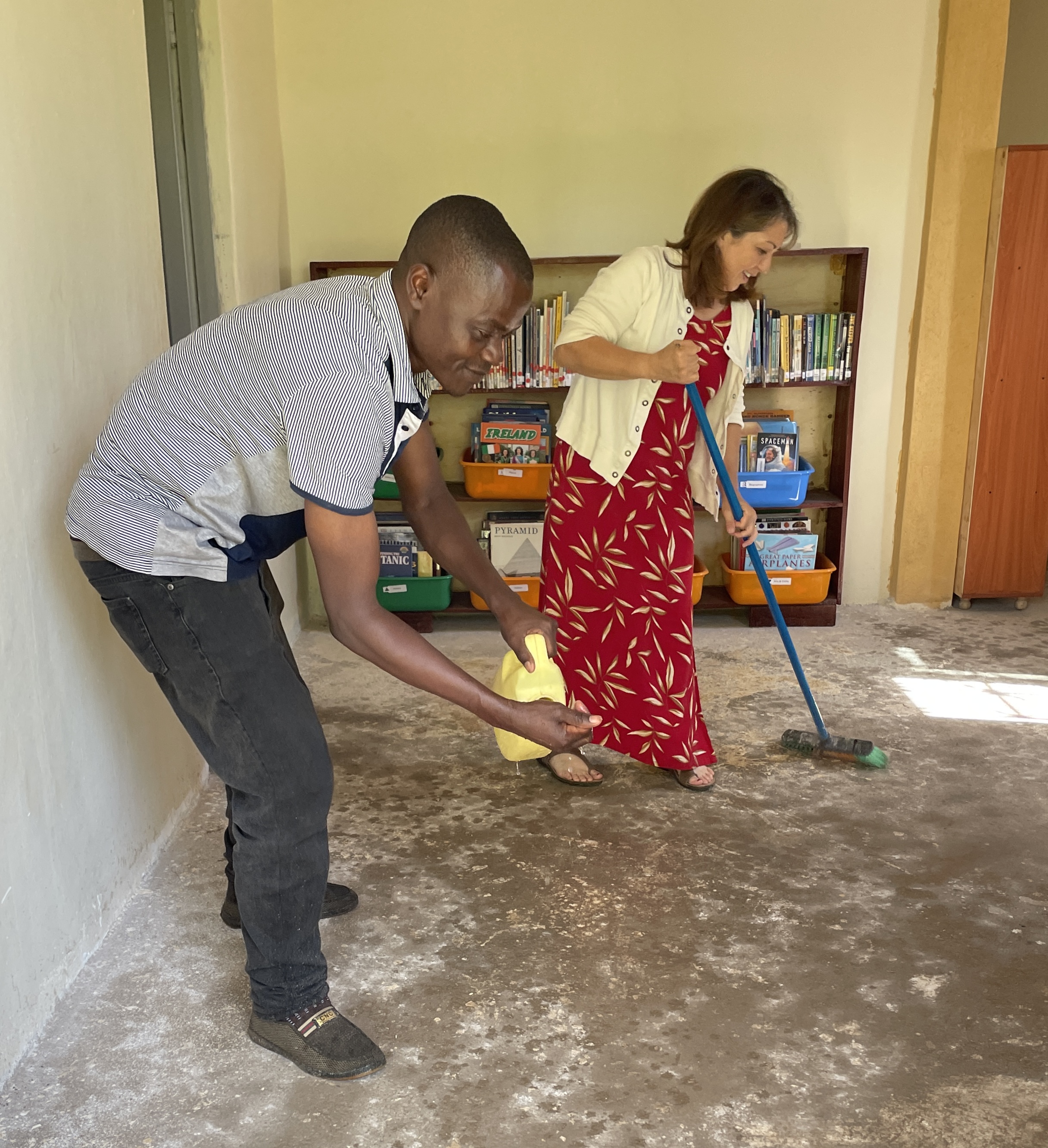 Our final day before the grand opening was full of activity. We swept the floor before laying down vinyl flooring. We also cranked up the music so that the children could have a dance party! Many of the children were going to be in school the next day, so we gave them the opportunity to celebrate the library opening before the rest of the community. We also discovered a local food vendor who made delicious chapati and rolexes. Chapati is an Indian flatbread, and when rolled up with an egg omelette, it becomes a rolex!